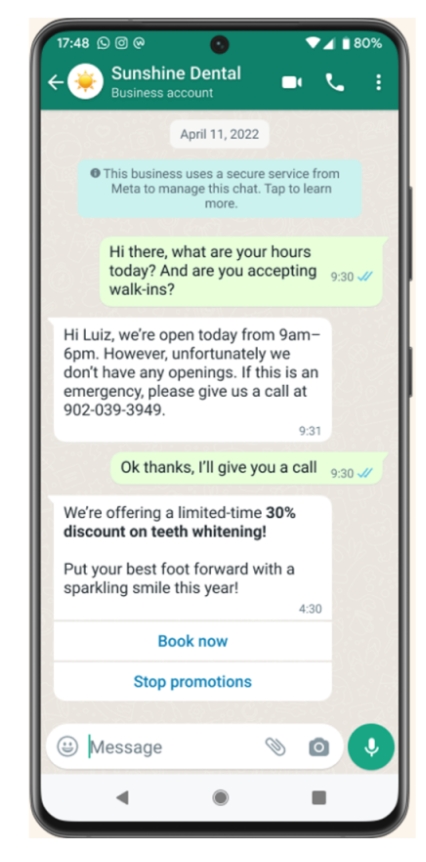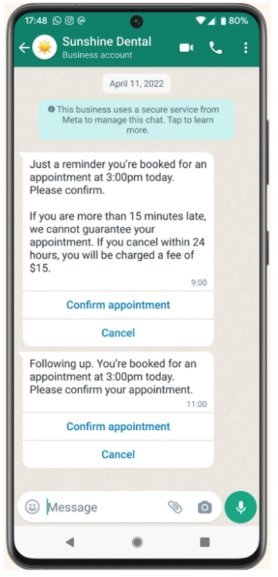 如24小時內,用戶首先發起對話,進行查詢預約情況並收到商家回覆,隨後商戶發送營銷對話推廣其服務,將會被計算為 1 次「服務對話 Service Conversation」及 1 次「市場營銷對話 Marketing Conversation 」。