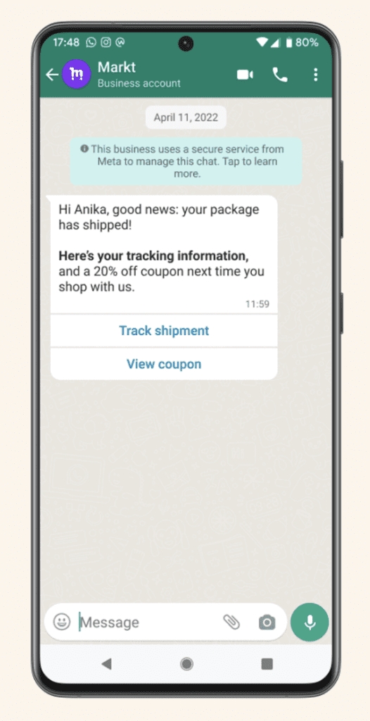 行銷對話 Marketing conversations:商家發起的用於向客戶行銷產品或服務的對話,例如向已同意接收訊息的客戶提供相關優惠等。任何不符合驗證或實用對話條件的商家發起的對話也屬於此類別。